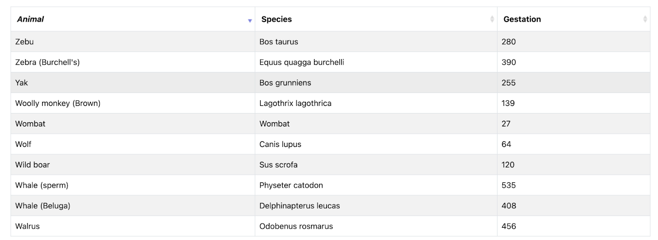 Add <table otherprops="sortable"> to allow each column to be sorted dynamically.
