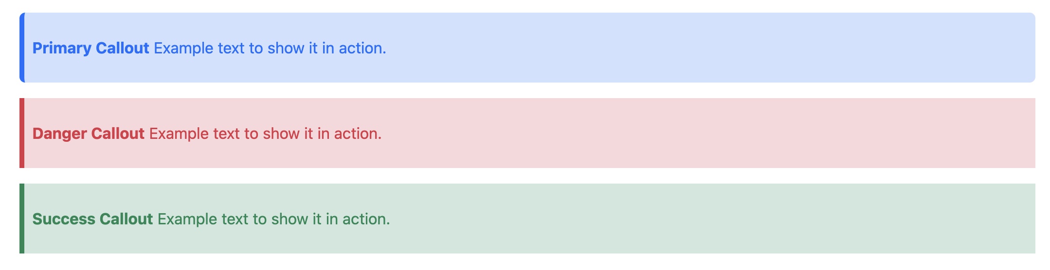 <!-- Handle the callout element transformation --> <xsl:template match="*[contains(@class, 'bootstrapCustom-d/callout')]"> <div> <xsl:call-template name="commonattributes"/> <xsl:call-template name="setidaname"/> <!-- Add special handling as necessary --> <xsl:apply-templates/> </div> </xsl:template> <!-- Add custom output class handling for the new component --> <xsl:template match="*[contains(@class, 'bootstrapCustom-d/callout')]" mode="set-output-class" priority="50"> <xsl:variable name="color" select="(if (@color) then @color else 'primary')"/> <xsl:variable name="classes" as="xs:string*"> <xsl:sequence select="tokenize('callout p-2 border-start border-5', '\s+')"/> <xsl:sequence select="concat('bg-', $color, '-subtle')"/> <xsl:sequence select="concat('border-', $color)"/> <xsl:sequence select="concat('callout-', $color)"/> <xsl:sequence select="tokenize(normalize-space($ancestry), '\s+')"/> </xsl:variable> <xsl:attribute name="class" select="normalize-space(string-join(distinct-values($classes), ' '))"/> </xsl:template>Figure 5. Sample callout.xsl file -