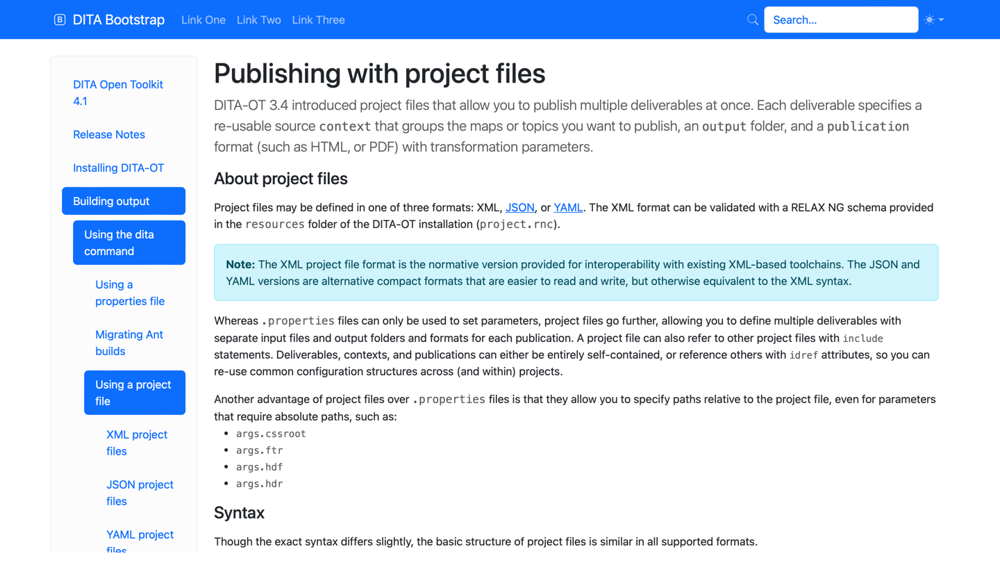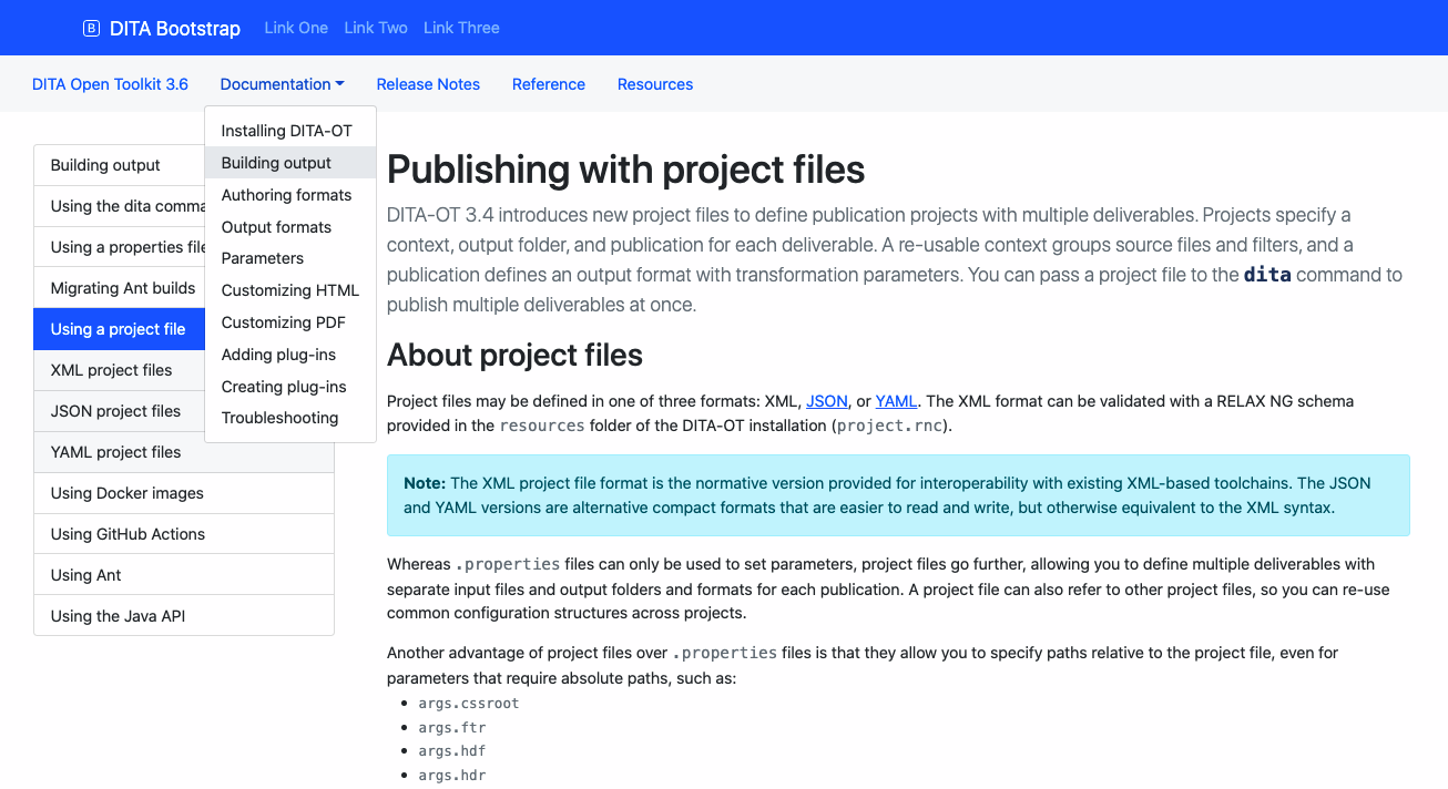Additionally, the first-level navigation menu can be switched to a horizontal Bootstrap navbar to reduce the depth of the ToC. To use this option, add the --menubar-toc.include=yes parameter to the dita command:
