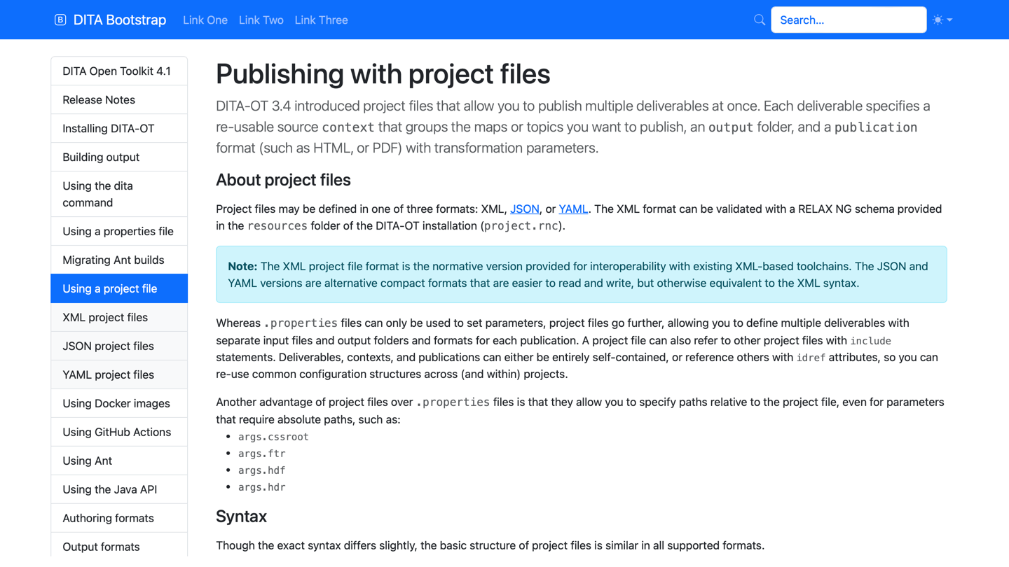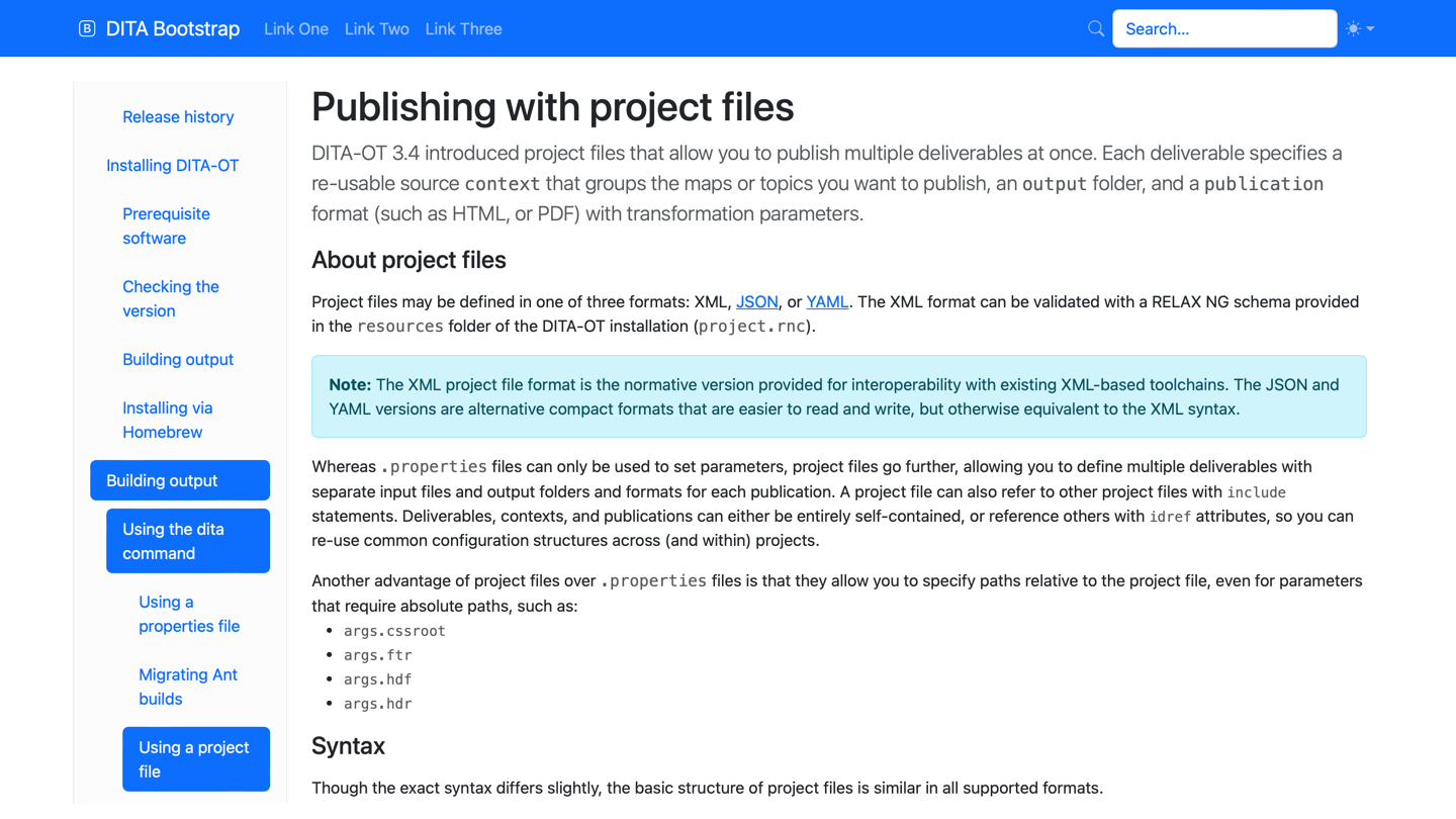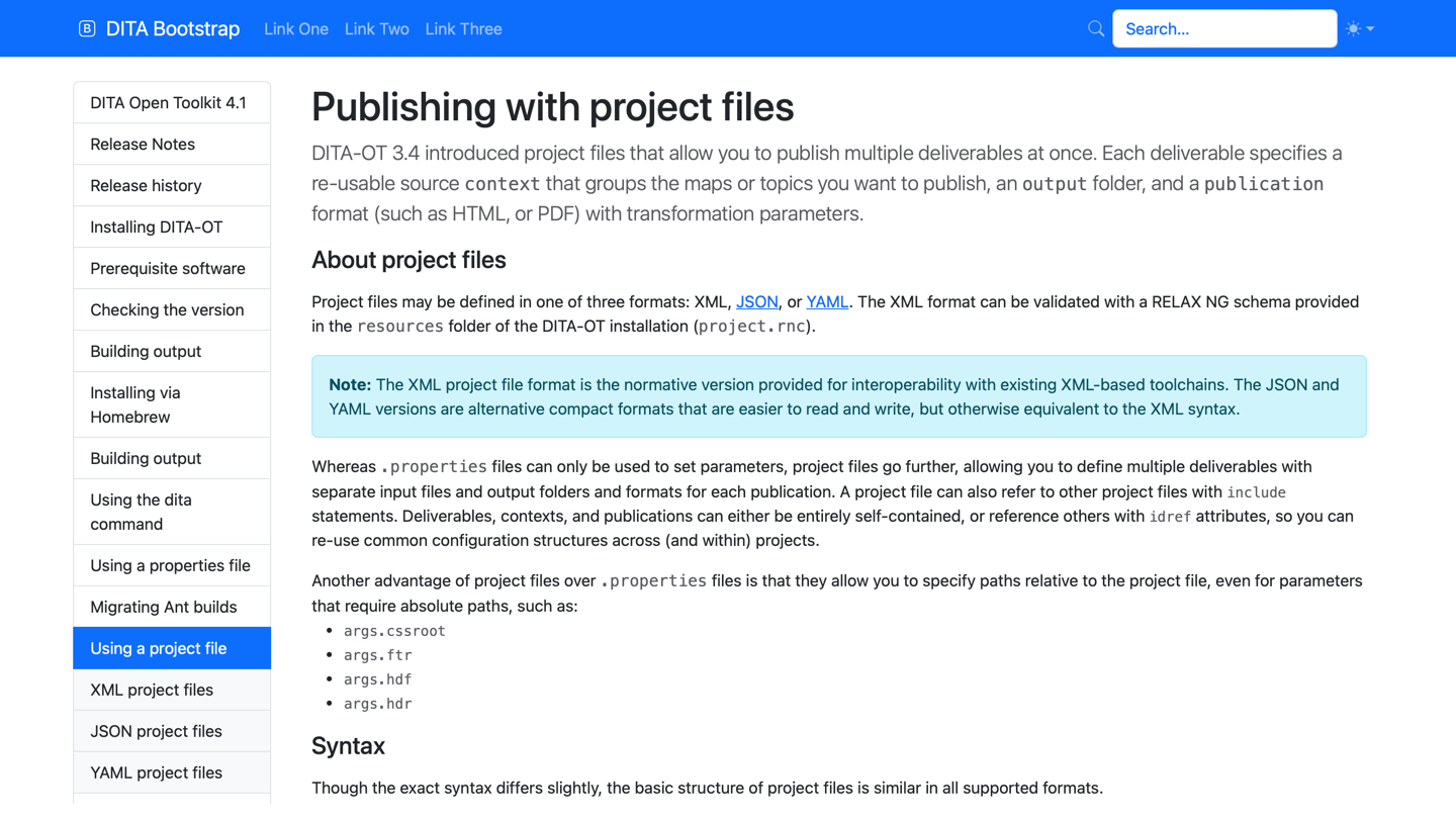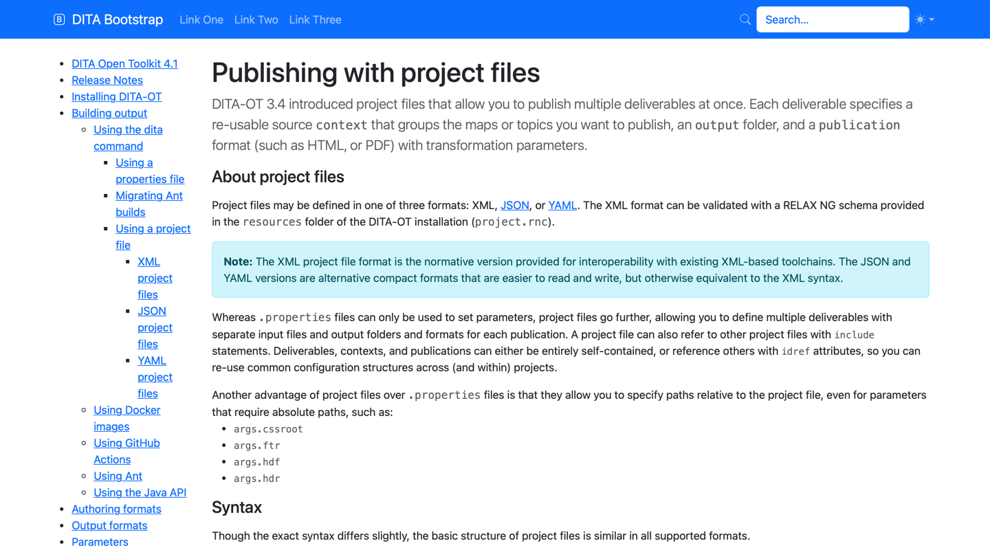 Additionally, the first-level navigation menu can be switched to a horizontal Bootstrap navbar to reduce the depth of the ToC. To use this option, add the --menubar-toc.include=yes parameter to the dita command: